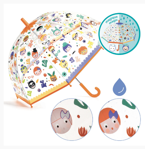 Beautifully illustrated umbrella to brighten a rainy day. Transparent PVC allows a child to see where they are going and the high dome provides better coverage. Playful illustrations of different faces.