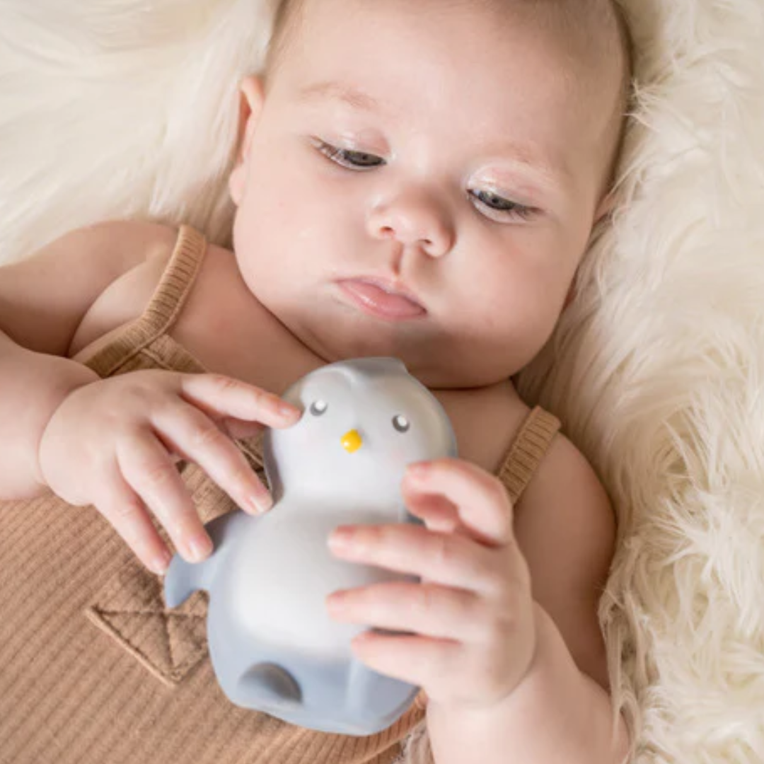 An adorable all rubber penguin teether that is great for little hands to grab and squeeze. Features a little bell that rattles inside to delight and entertain little ones. This penguin's little arms are a perfect spot to chew on to relieve sore gums.